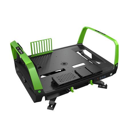 In-Win X-Frame 2.0 blacK + Green - test bench / open air with dual orientation (desktop / tower) + detachable stand with 360 degree free rotation- bundled In Win S1-1065W full-modular transparent PSU + aluminium crimson green top cover with 65w emit outputs ( for lighting + cooling + USB charging when PC is off ) , 165mm silent fan - 8mm thick aluminium carry handles , slide out screw storage block for easy access to screws ; 1x front usb3.1 type C + 3x usb3.0 + audio in/out - 1x multifunction bracket for 2.5" or pump or reservior , 1x 5.25" + 3x 3.5" or 7x 2.5" - up to 3x 120mm fans , support u to 360mm radiators - E-ATX with 8x expansions slots
