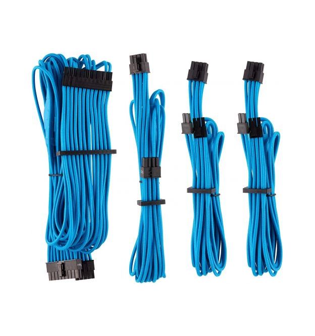 corsair CP-8920218 bLue premium individually sleeved flexible paracorded modular cable starter kit ( type4 Gen4 ) , 4x cable combs - include 1x 610mm ATX ( 20+4pin) + 1x 750mm EPS12V(4+4pin) + 2x 650mm PCi-E 8(6+2) pin , heatshrink-less connectors , with modular interlocking cable combs , with carry bag - for RMX , RMi series, HX, HXi , AX , AX1600i , SF series