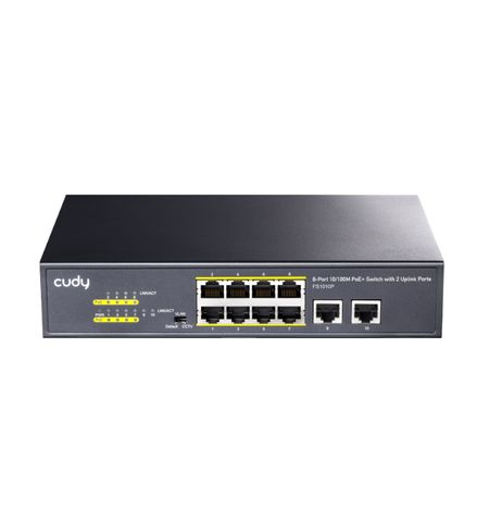 The Cudy FS1010P 10-Port 10/100M PoE+ Switch allows you to manage your home or office network with ease. It features 8 Ethernet PoE ports and 2 uplink ports. Its RJ-45 connectors support any 10/100Mbps Ethernet devices and its compliant with IEEE 802.3af/802.3at network standards.